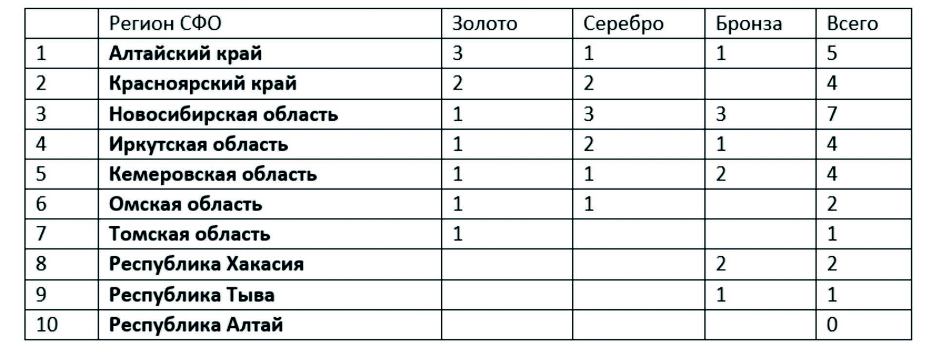 На первом месте по количеству золотых медалей находится Алтайский край. А больше всего наград разного достоинства у Новосибирской области.