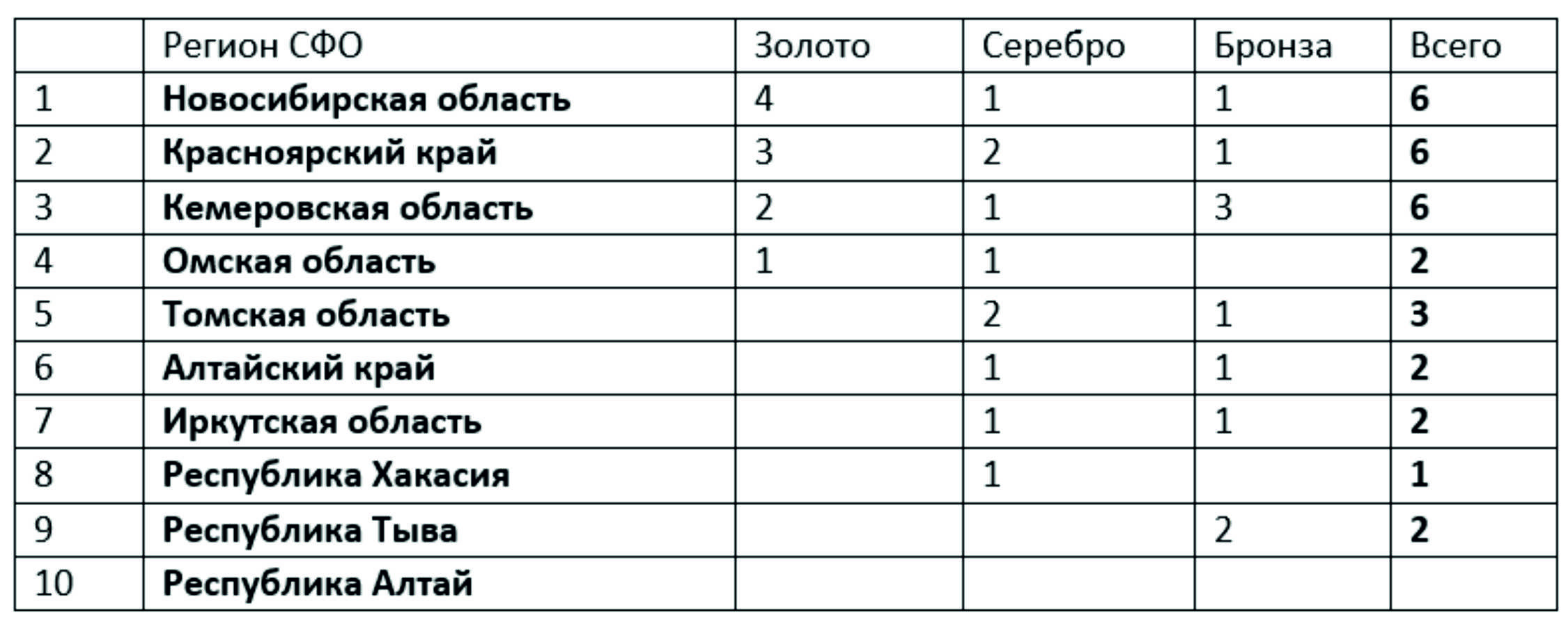 И сразу три региона: Новосибирская область, Красноярский край и Кемеровская область добавили в свою копилку по 6 наград разного достоинства.